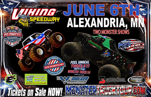 TOUR invades the VIKING SPEEDWAY on June 6th for TWO Monster shows! See these incredible 10,000-pound, car crushing giants compete in racing,
